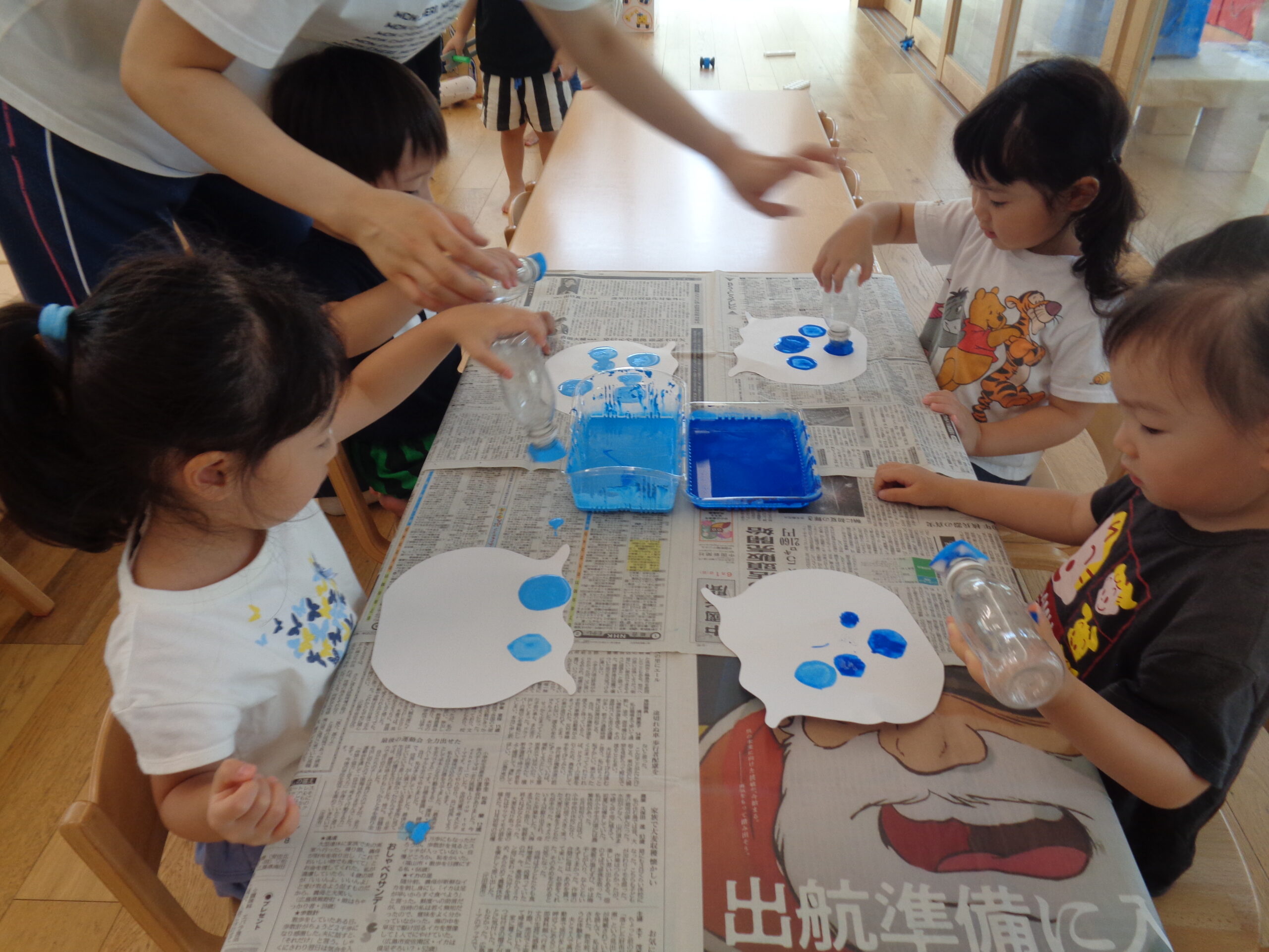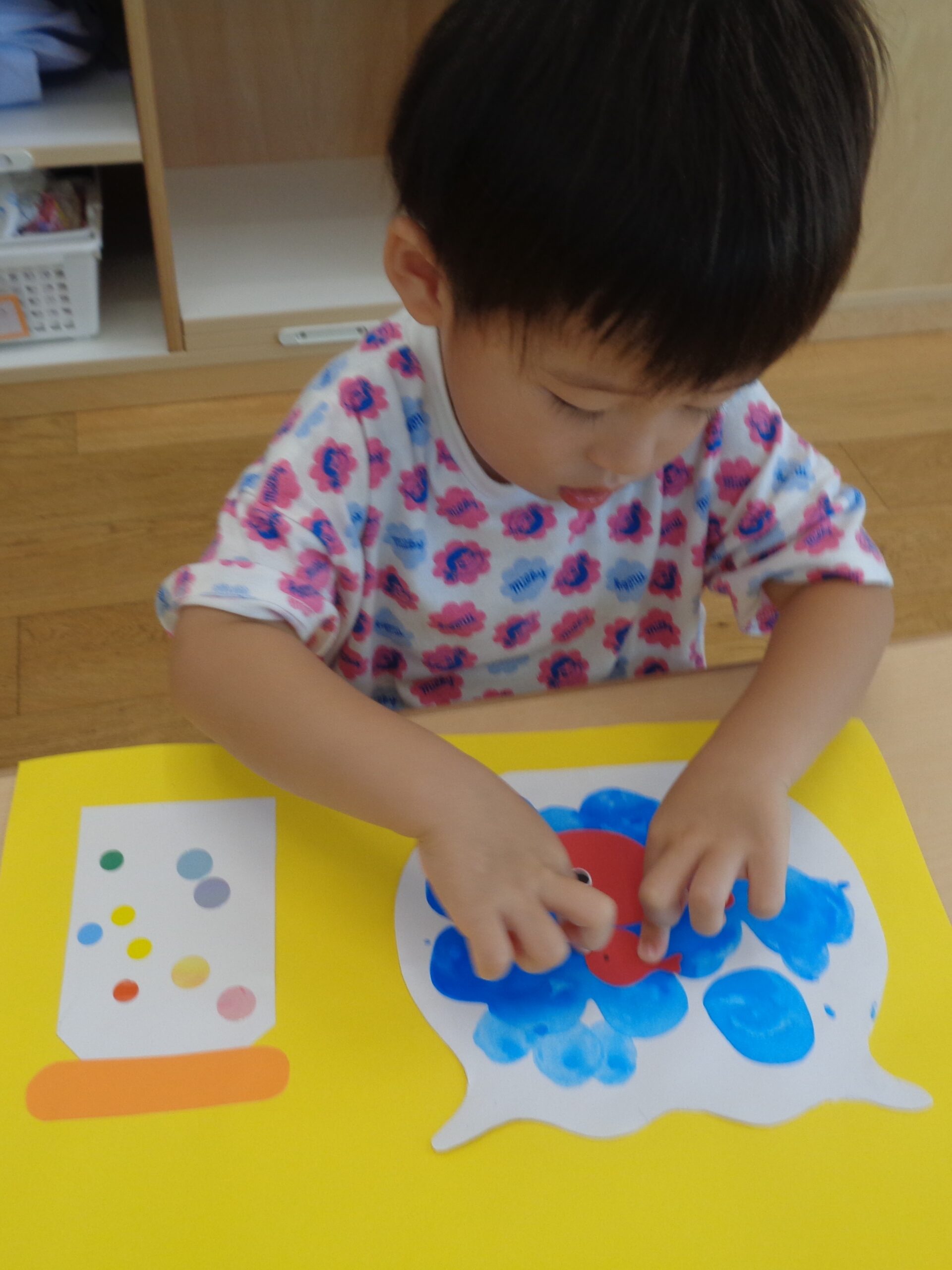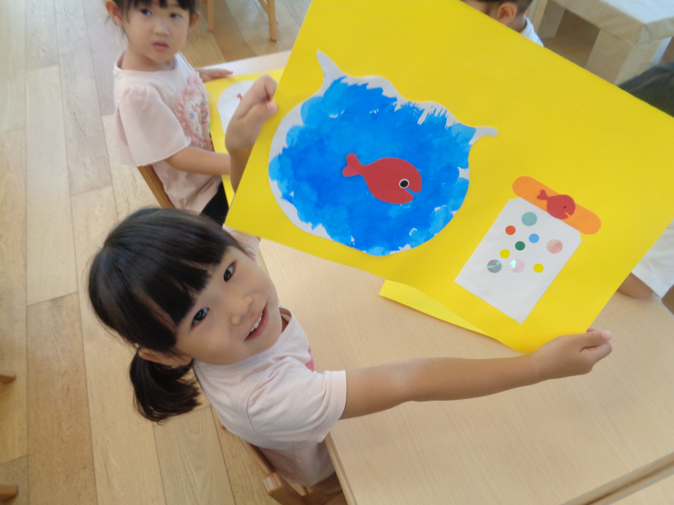 TOP > ブログ ブログ ポンポン ぺったんこ (どんぐり組 8月の制作です) 子どもたちの大好きな絵本『きんぎょがにげた』 絵本を読むときは「ここにいる!」「お花になってる!!」といつも楽しみながら見ています。 そんな『きんぎょがにげた』の制作をしました! 金魚鉢の中に水を入れるよ! ポンポン…っと♪ 翌日、金魚を好きな場所にぺったんこ♪ 金魚鉢の中で泳がせてみたり、水の中から逃げ出したり ご飯を食べに行ったことにしたり…♡ 自分なりに考えた素敵な作品ができました✨ 2025.09.24 5 / 350« 先頭«...34567...102030...»最後 »