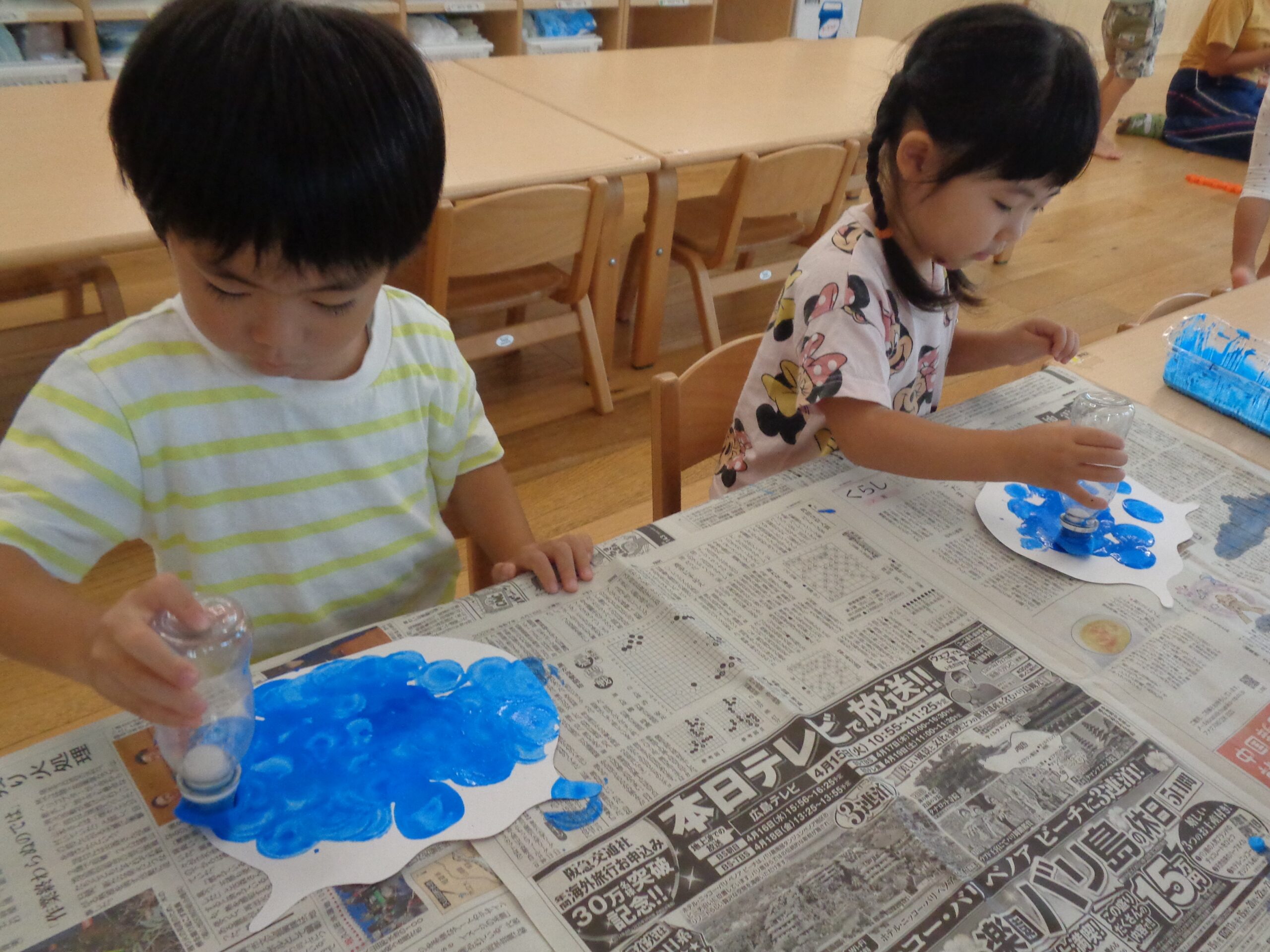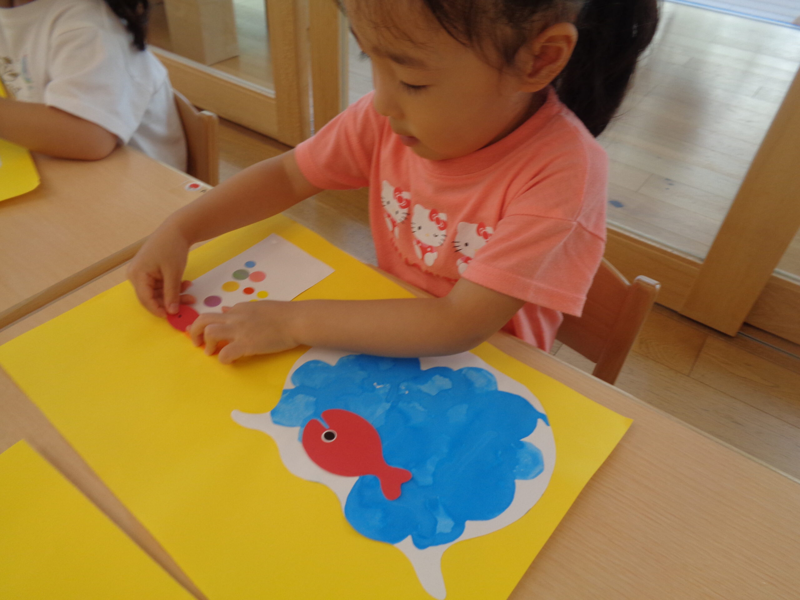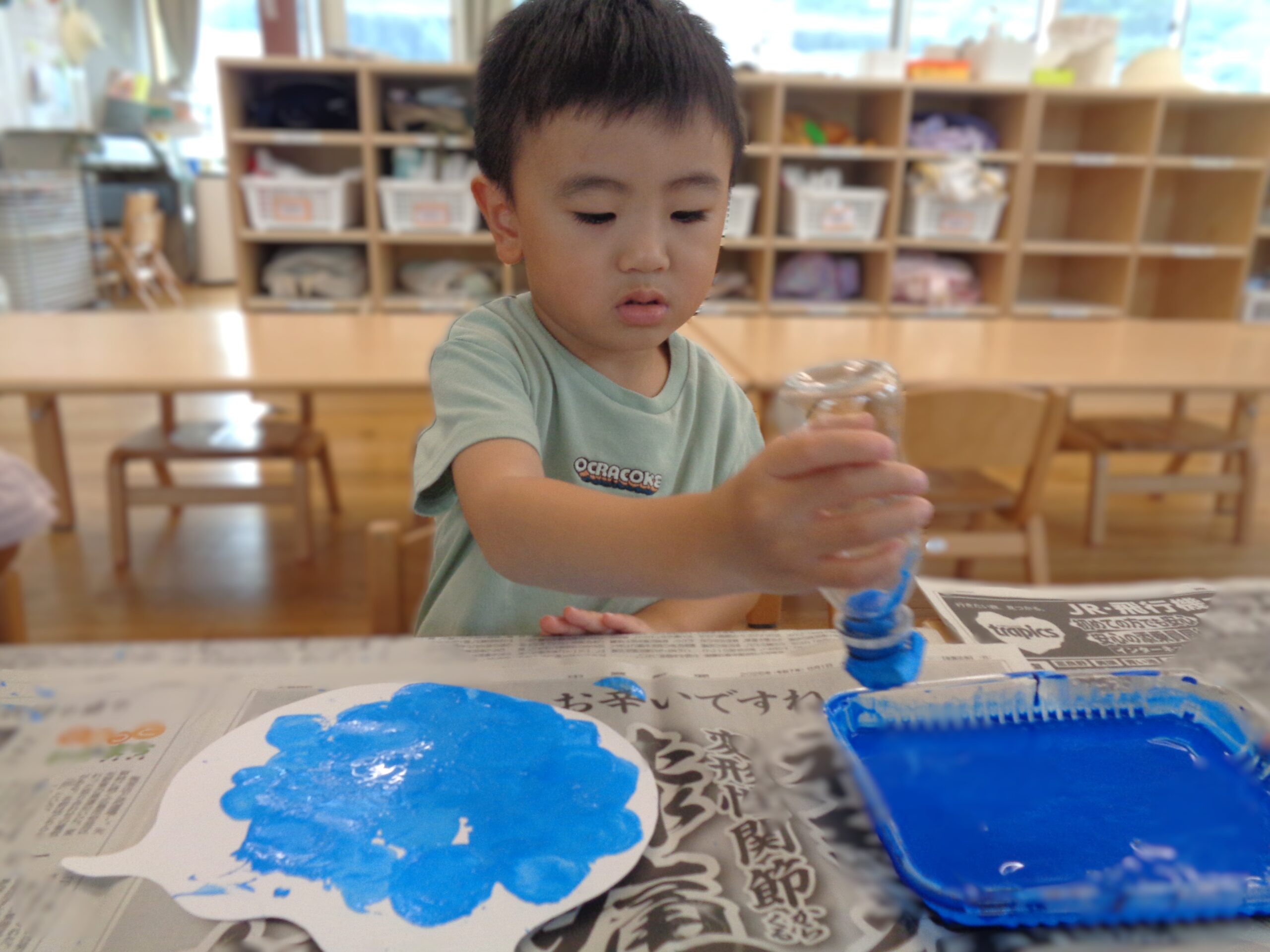 TOP > ブログ ブログ ポンポン ぺったんこ (どんぐり組 8月の制作です) 子どもたちの大好きな絵本『きんぎょがにげた』 絵本を読むときは「ここにいる!」「お花になってる!!」といつも楽しみながら見ています。 そんな『きんぎょがにげた』の制作をしました! 金魚鉢の中に水を入れるよ! ポンポン…っと♪ 翌日、金魚を好きな場所にぺったんこ♪ 金魚鉢の中で泳がせてみたり、水の中から逃げ出したり ご飯を食べに行ったことにしたり…♡ 自分なりに考えた素敵な作品ができました✨ 2025.09.24 5 / 350« 先頭«...34567...102030...»最後 »