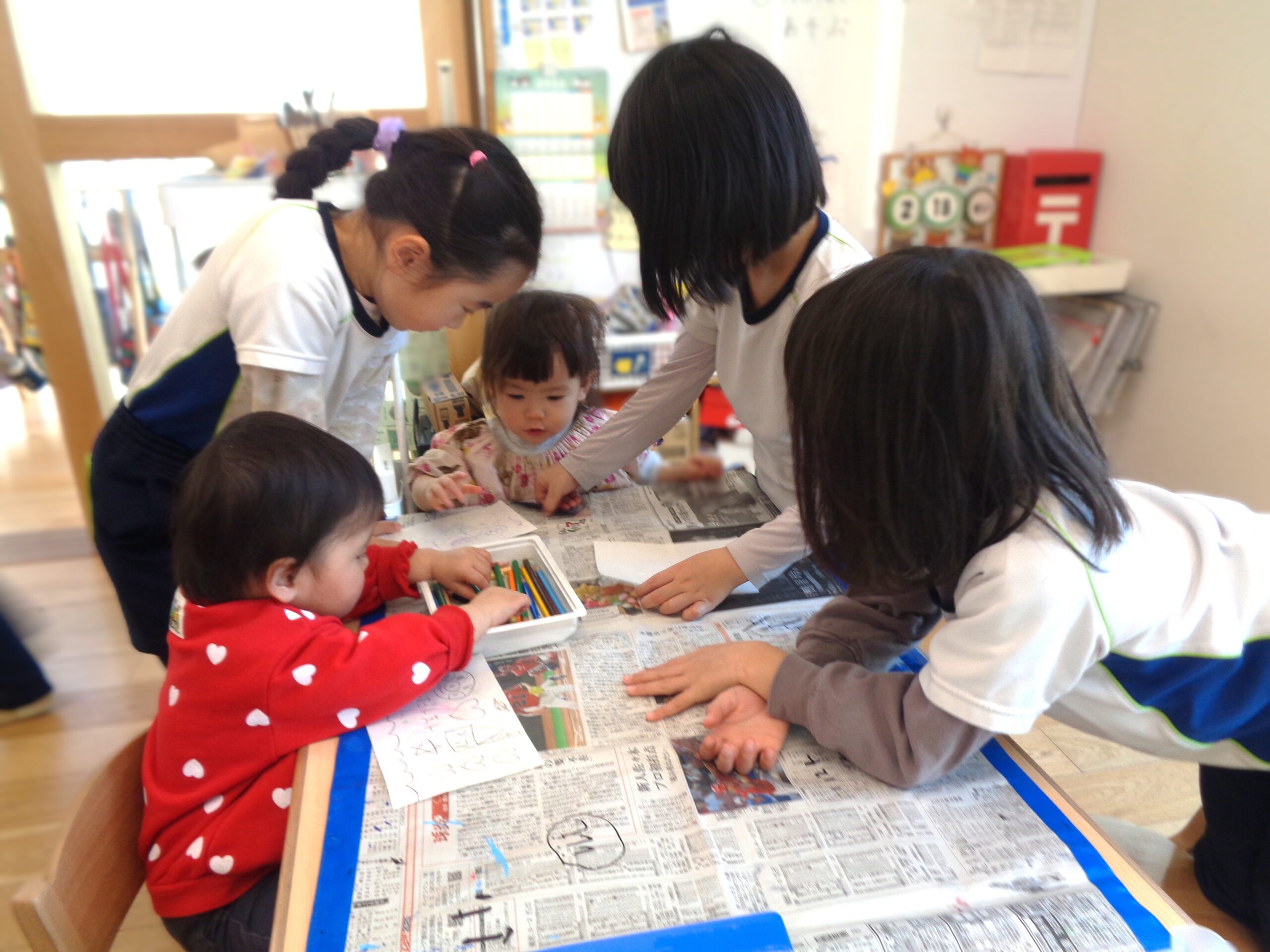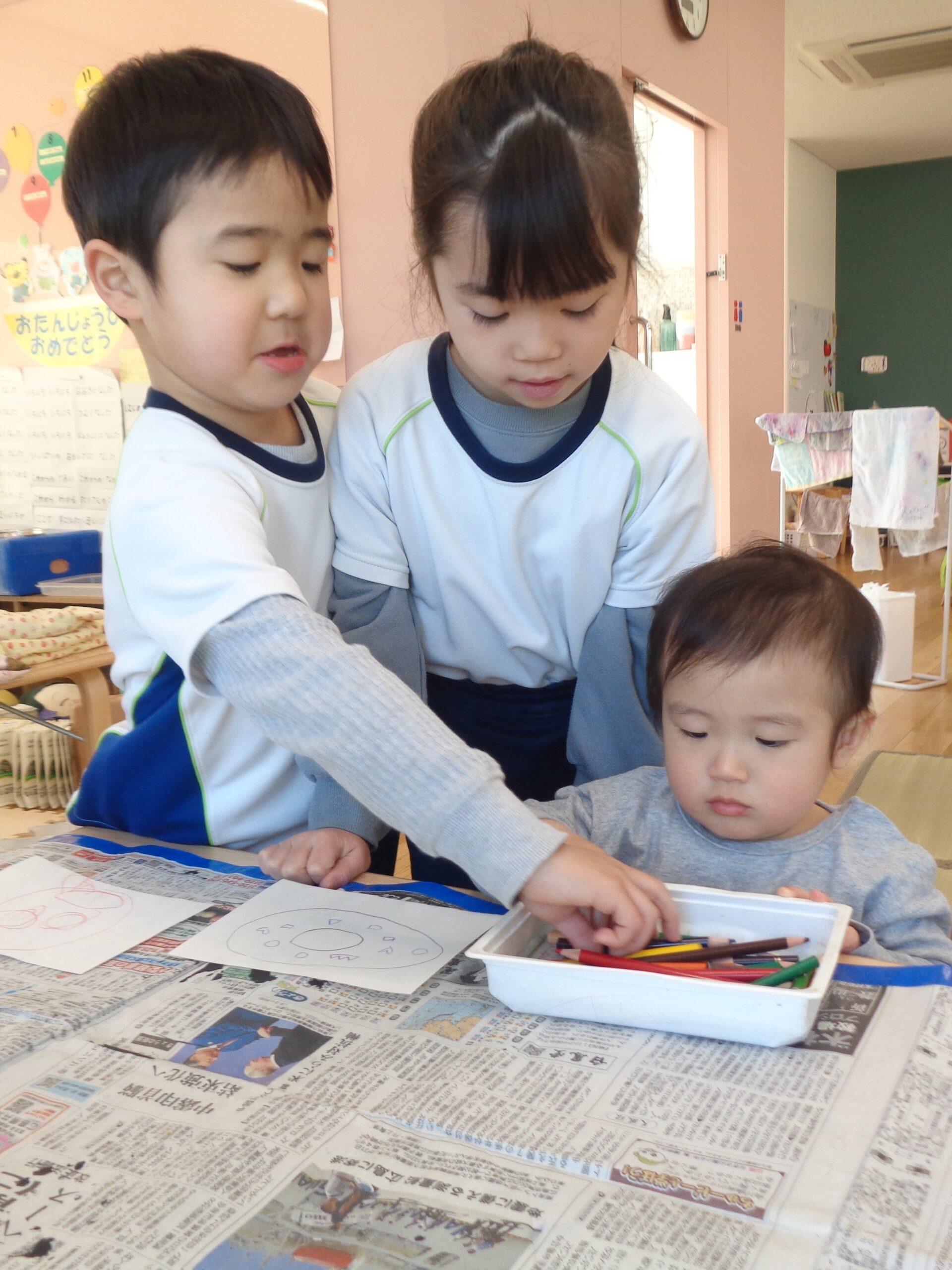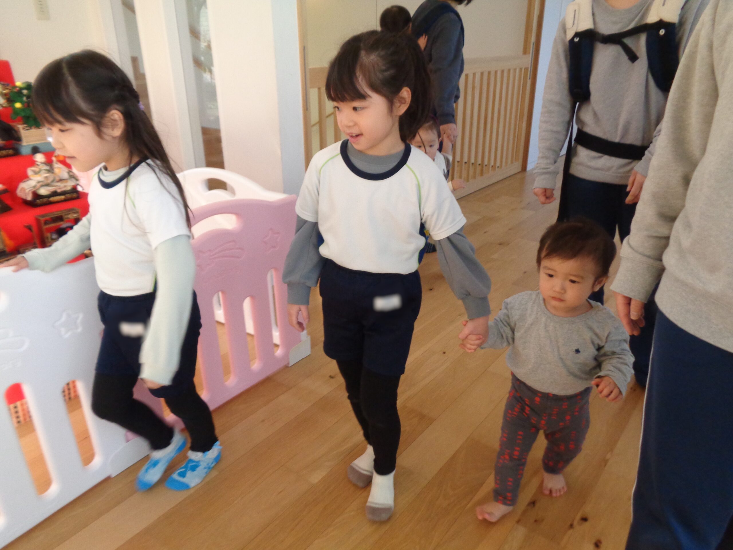 TOP > はりきるふくろう組! ブログ はりきるふくろう組! 「たんぽぽ組が遊びに来るぞ‼」 ということで、みんなが興味を持ってくれそうなおもちゃや絵本を用意したり、セッティングしたりやらで慌ただしいふくろう組 たんぽぽ組がやってくると、優しく手を引き一緒に遊んだり、絵本を読んであげたり💕 とっても頼りになりました👏 外でも出会うとこの通り! 本当に優しくお世話好きなふくろう組でした♪ 2026.03.06