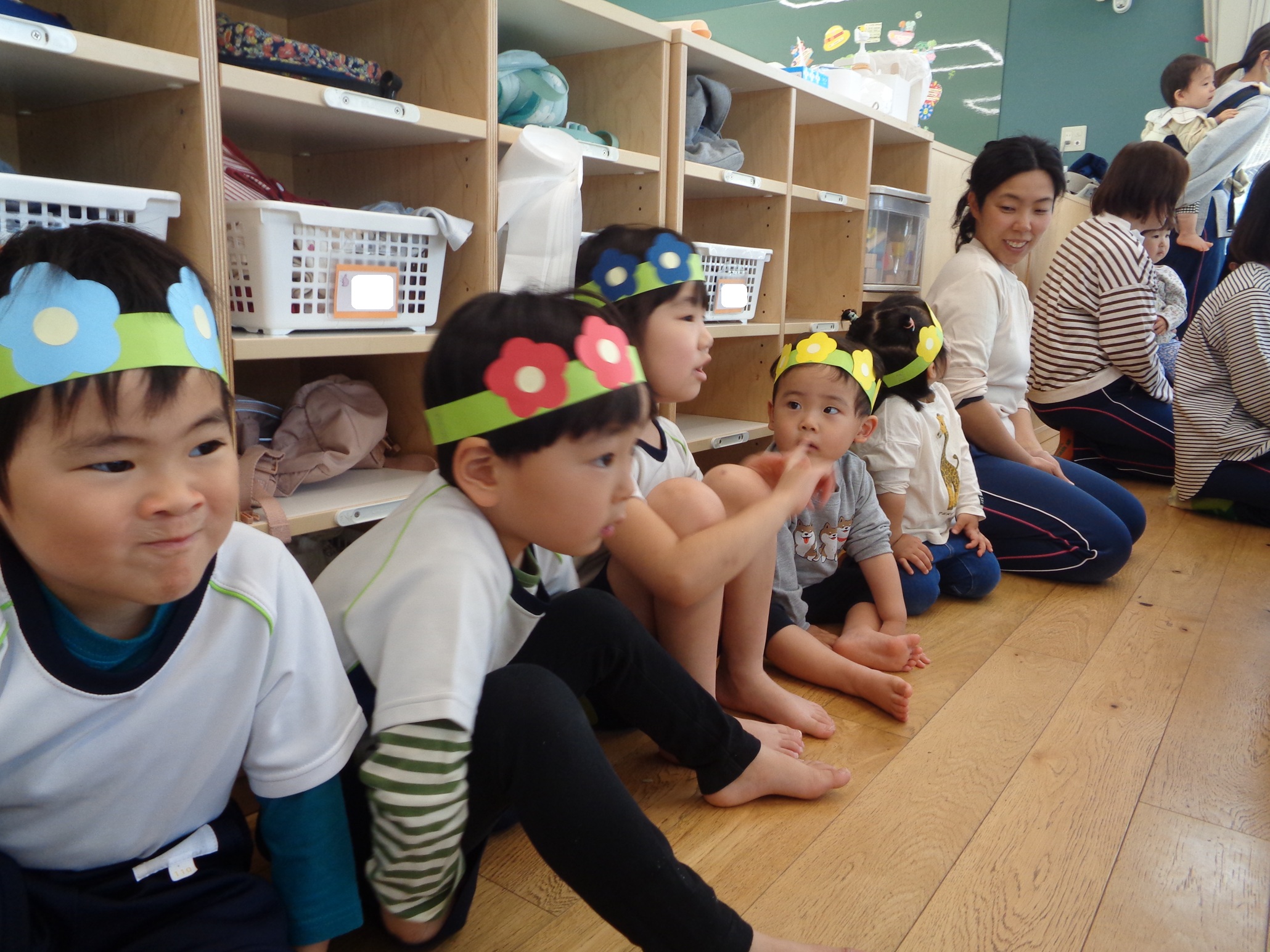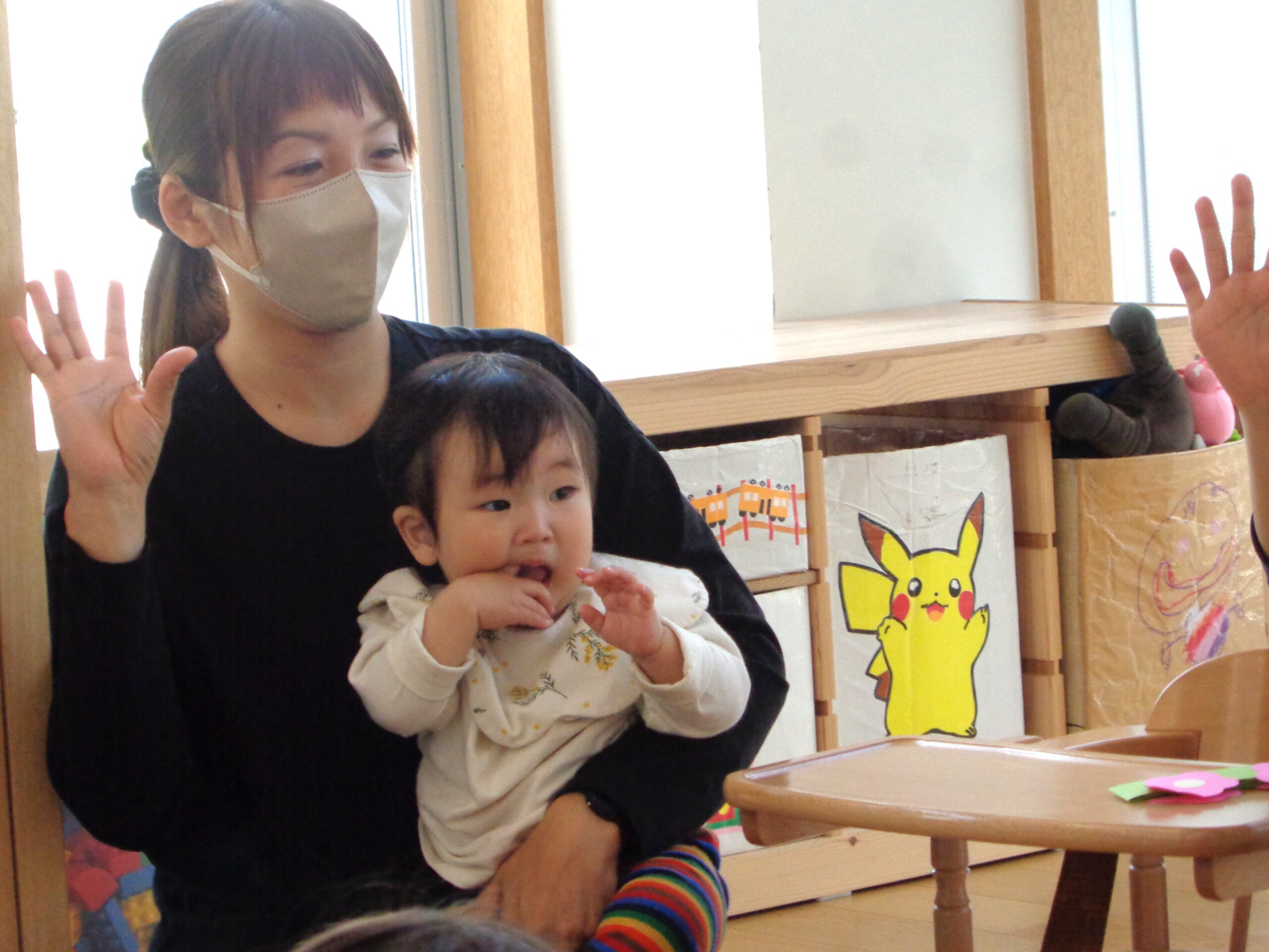 乳児さんは上手に手を挙げてお返事したり、