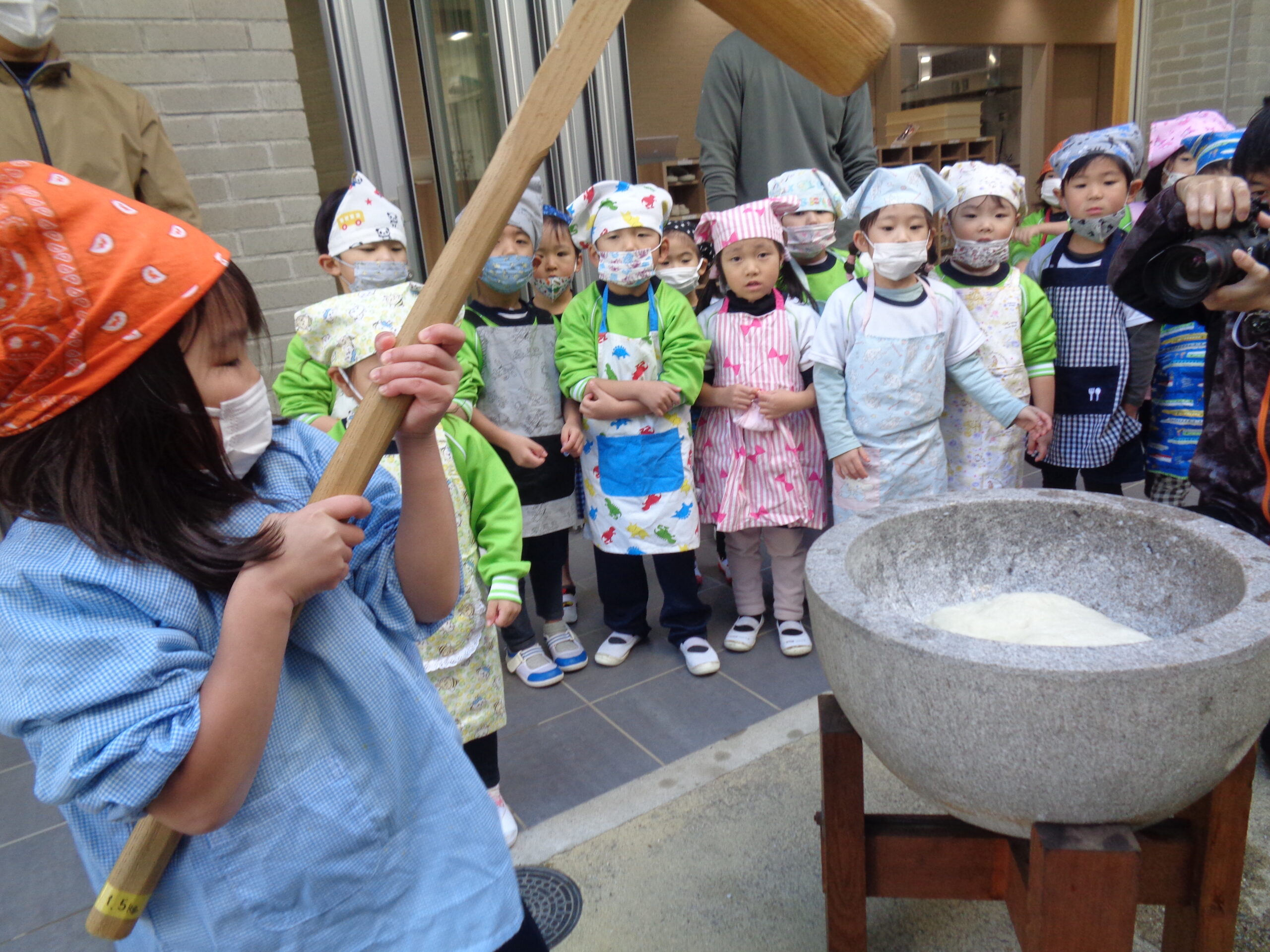 迫力あるもちつきの様子を目の前でじーっと観察し