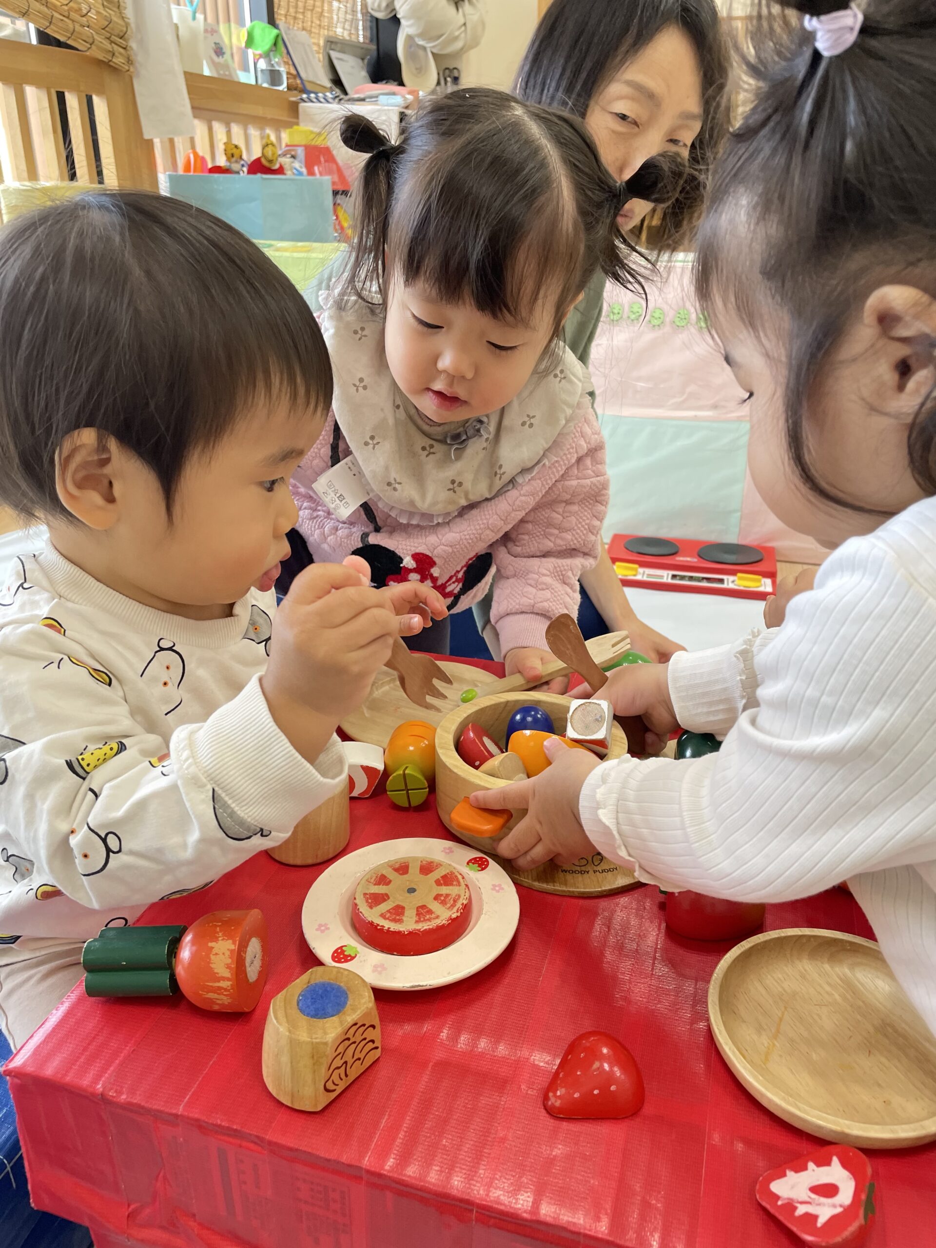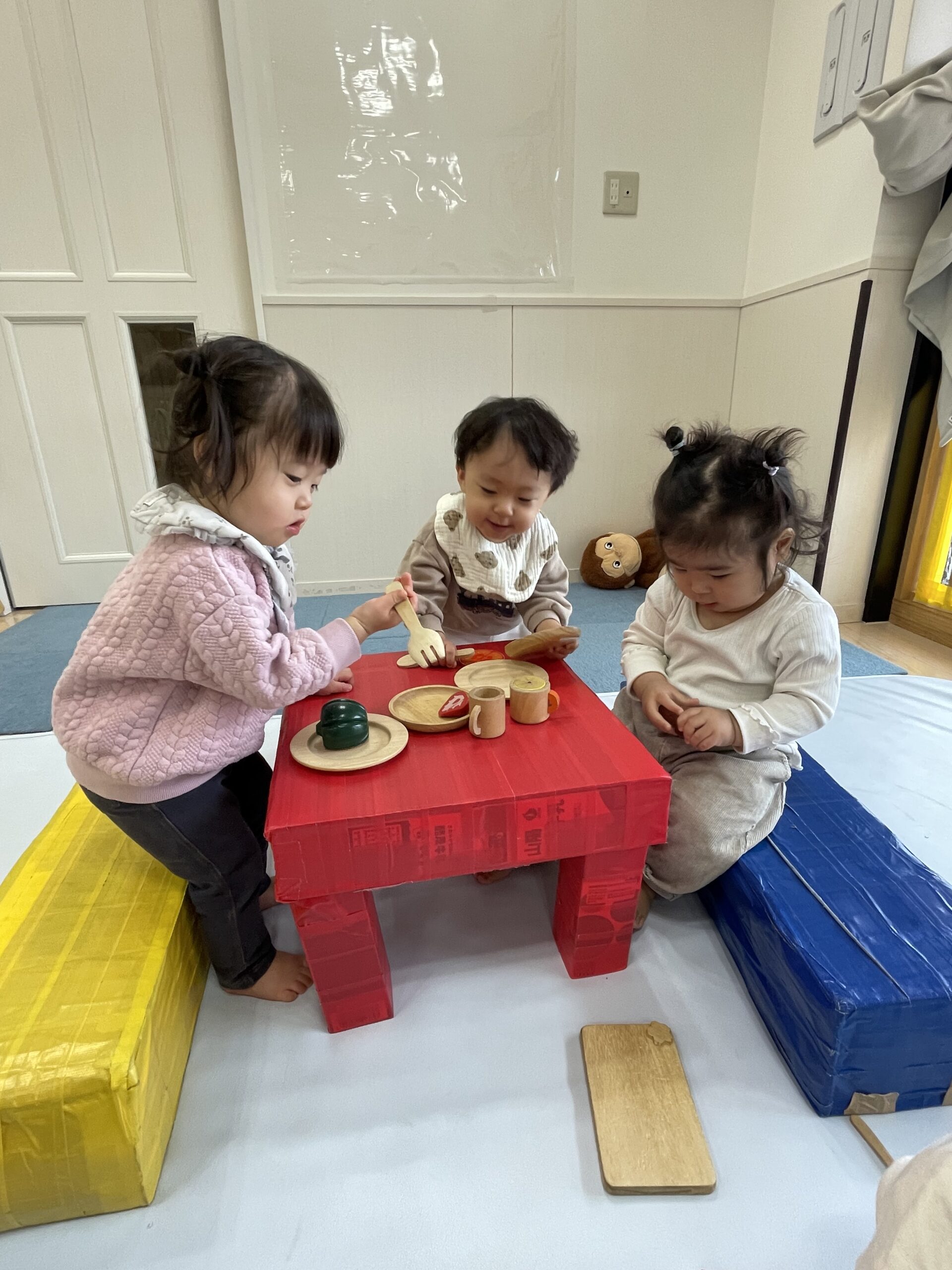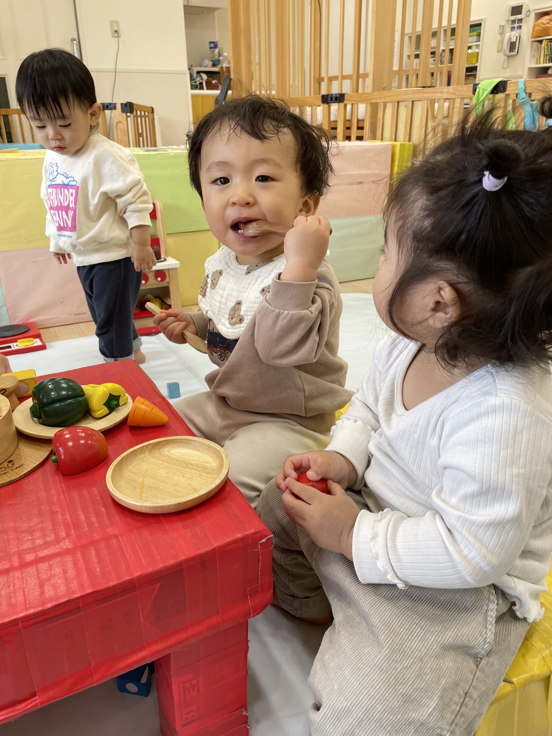 TOP > 「たんぽぽ0歳 ままごとたのしいね!」 ブログ 「たんぽぽ0歳 ままごとたのしいね!」 木製のままごとセットであそびました。 机と椅子も用意して、初めて見る木製のままごとセットに目を輝かせる子どもたち✨ 「ん~ おいしい!!」 オーブンで野菜を焼いて… 「はい、どうぞ。めしあがれ💕」 おいしいのポーズも見せてくれました😊 お料理したり、おいしく食べたり、お友だちとのやりとりを楽しみながらあそぶ姿が見られるようになりました🌈 2025.12.22