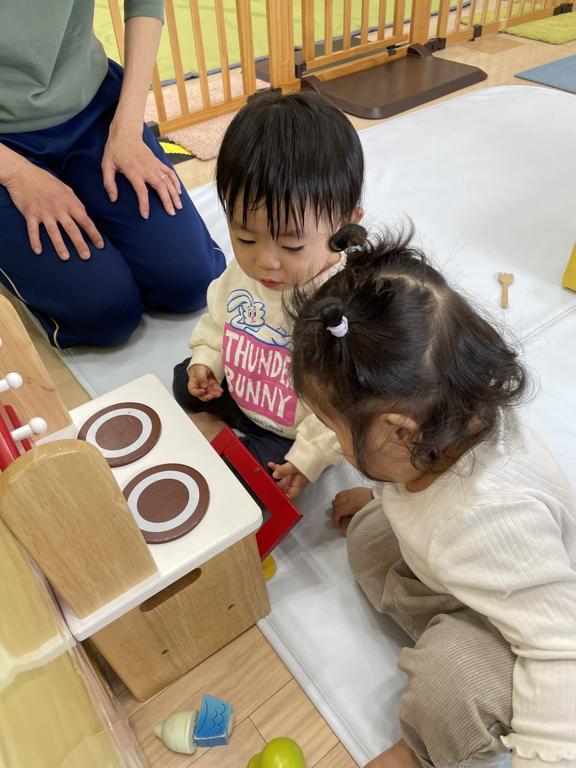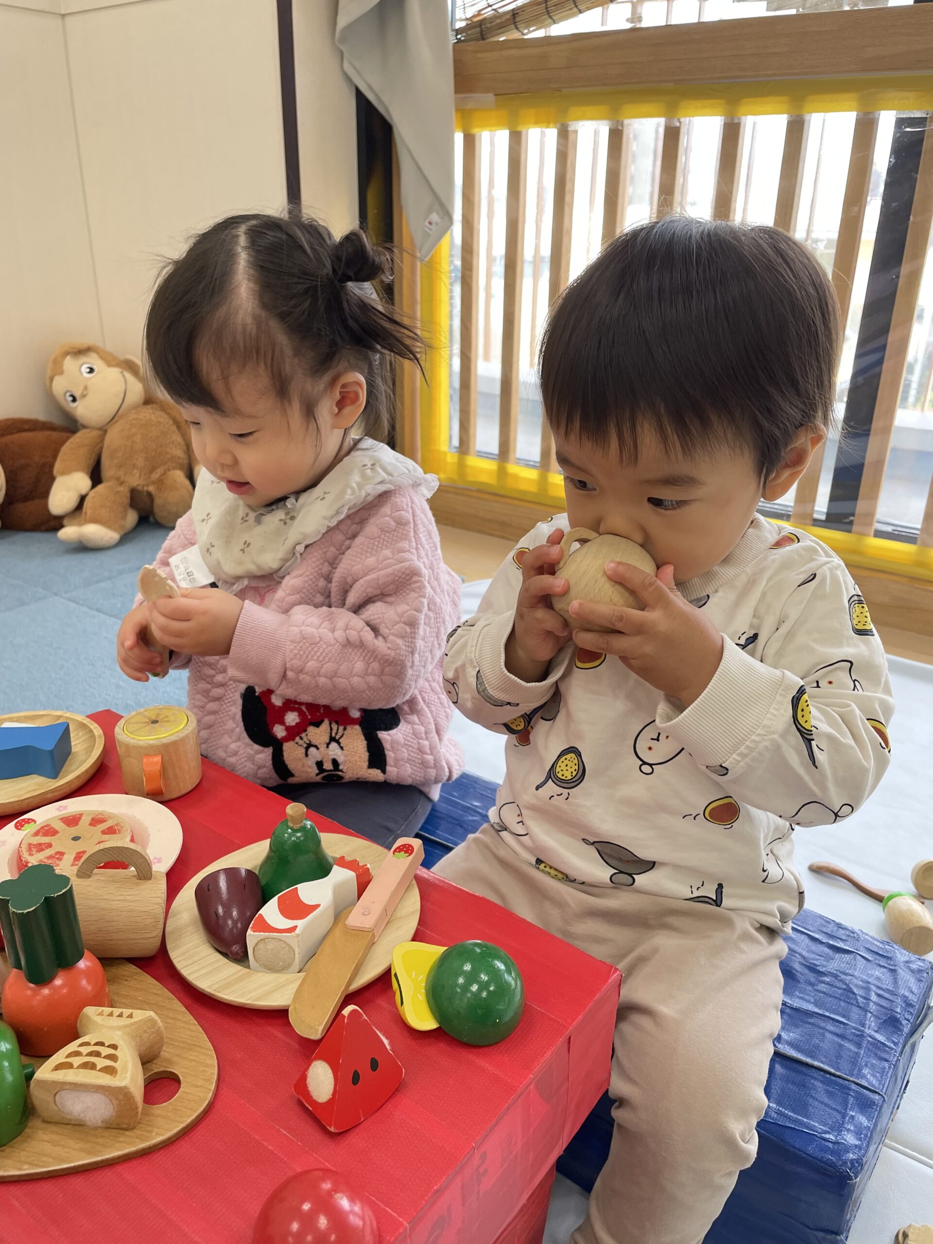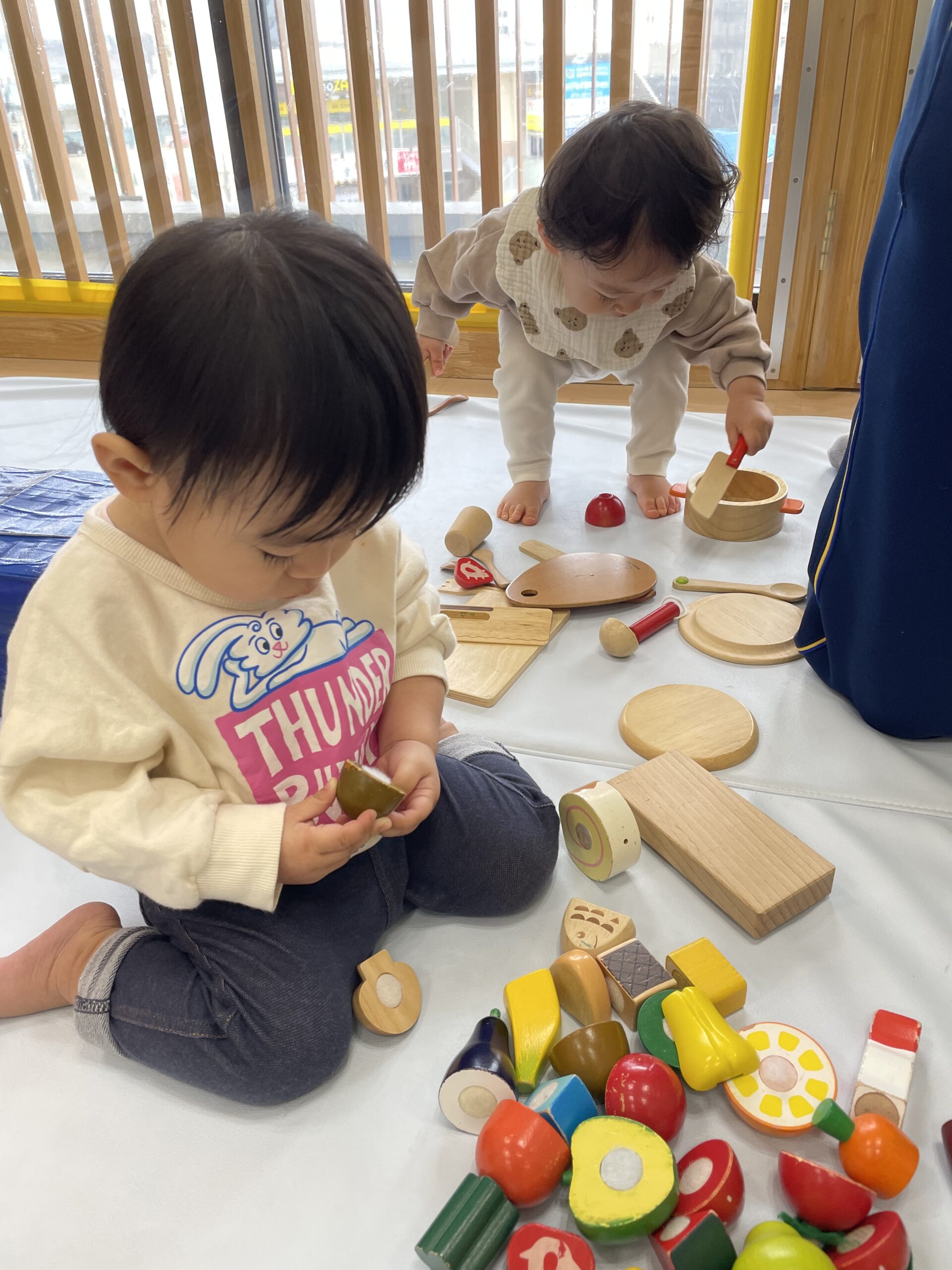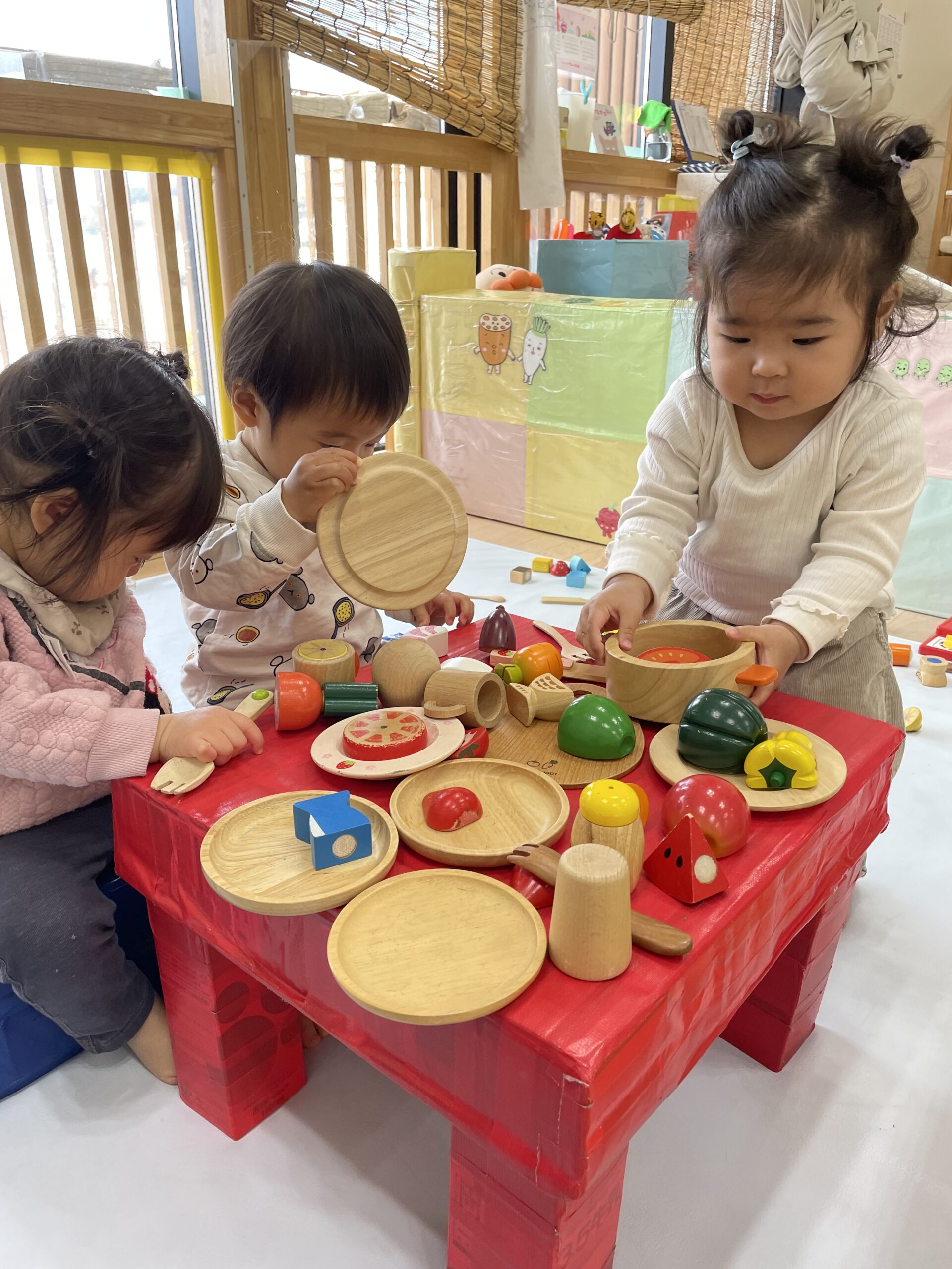 TOP > 「たんぽぽ0歳 ままごとたのしいね!」 ブログ 「たんぽぽ0歳 ままごとたのしいね!」 木製のままごとセットであそびました。 机と椅子も用意して、初めて見る木製のままごとセットに目を輝かせる子どもたち✨ 「ん~ おいしい!!」 オーブンで野菜を焼いて… 「はい、どうぞ。めしあがれ💕」 おいしいのポーズも見せてくれました😊 お料理したり、おいしく食べたり、お友だちとのやりとりを楽しみながらあそぶ姿が見られるようになりました🌈 2025.12.22